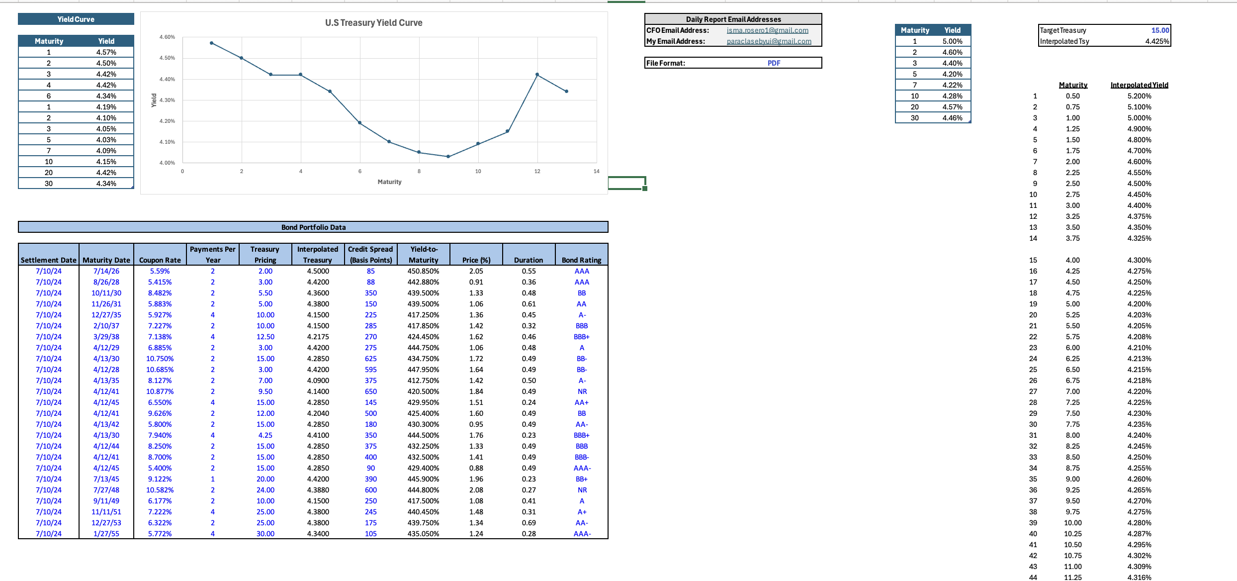 Excel/VBA model that: - prices a portfolio of bonds (clean/dirty price), - builds an interpolated U.S. Treasury curve, - calculates duration, YTM, credit spread, - and exports a clean PDF report.